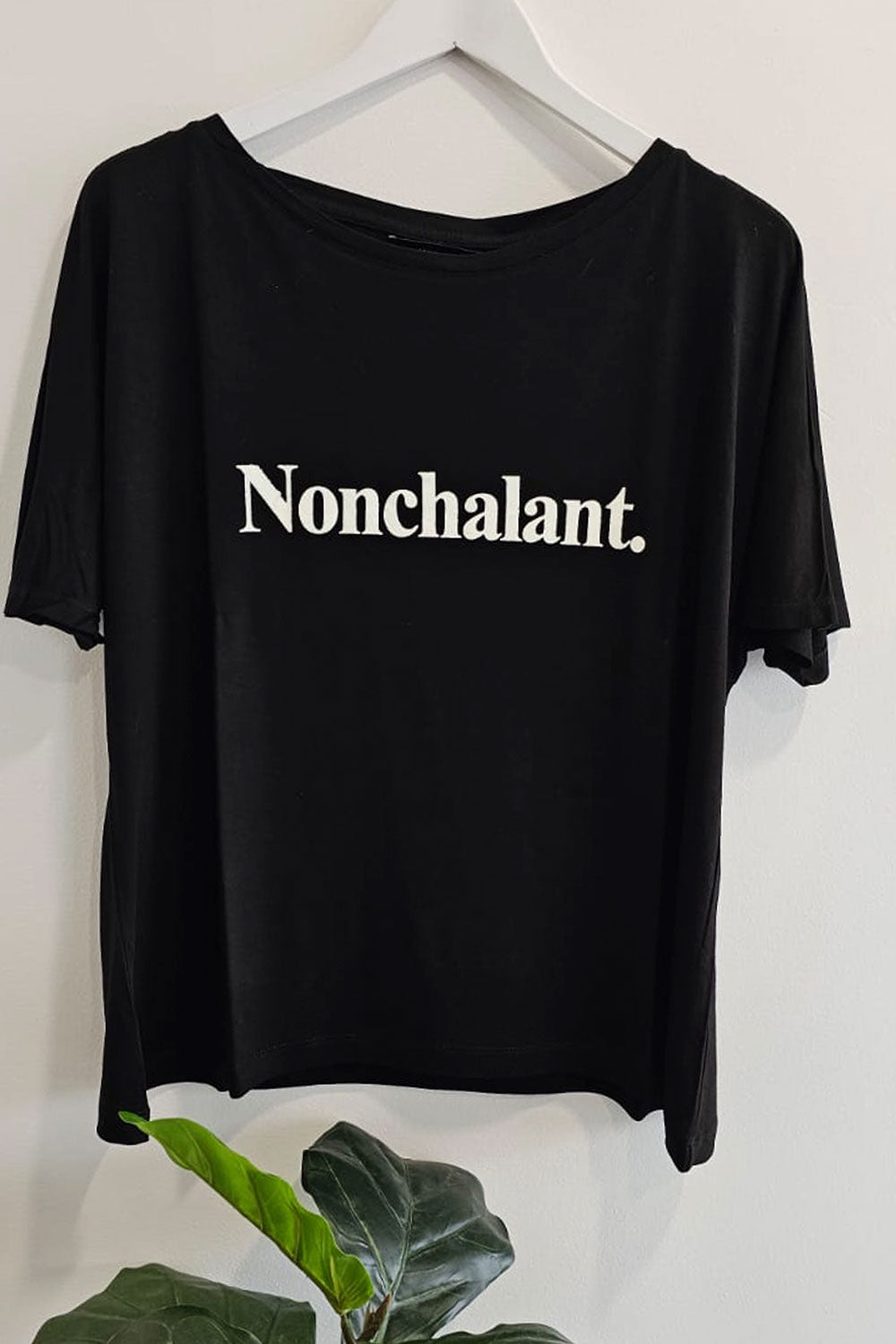 Crafted from soft, breathable rayon, this lightweight t-shirt offers a relaxed fit with a round neckline for all-day comfort. The front features a “Nonchalant” print, adding a touch of understated attitude to your everyday look.