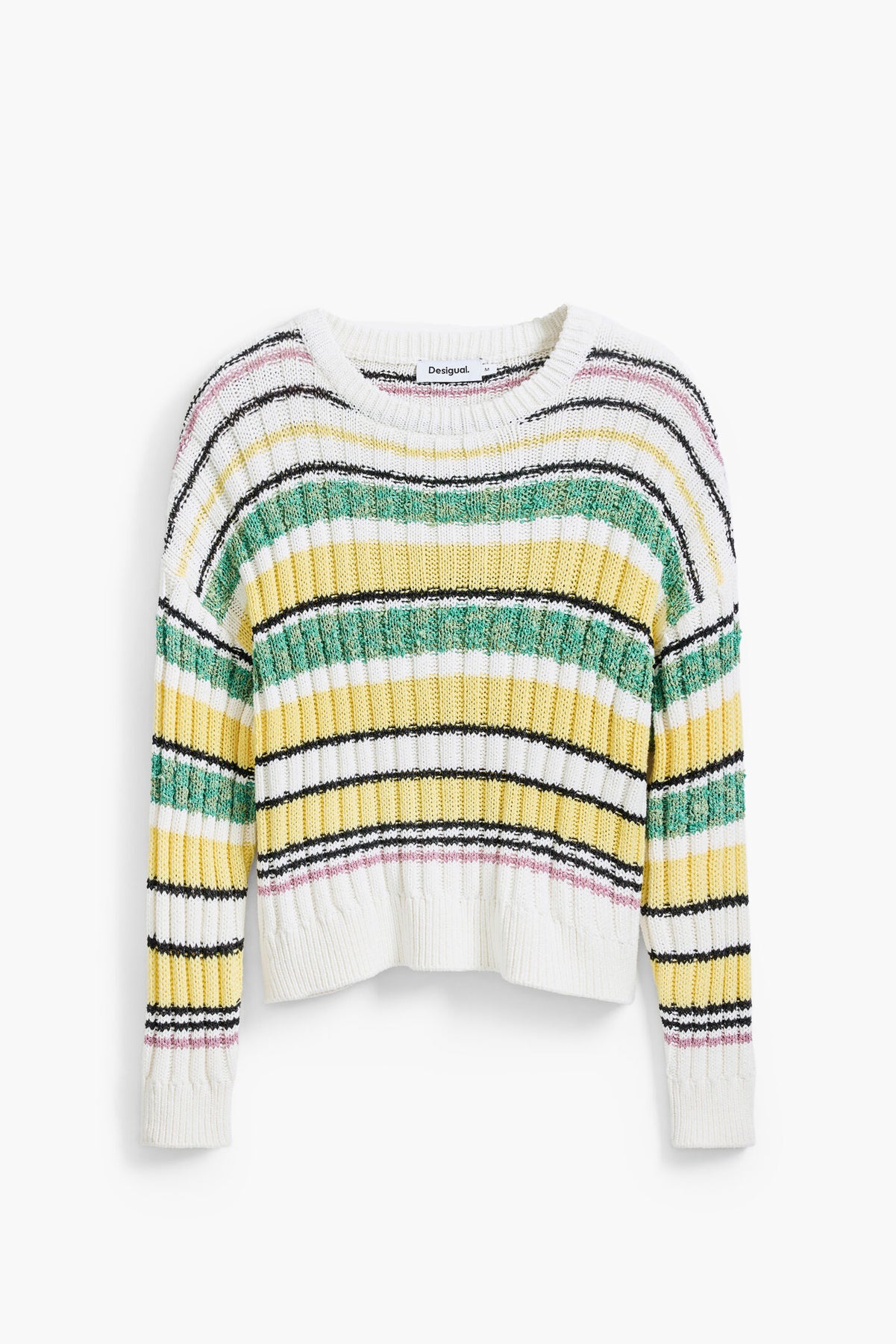 A playful take on classic knitwear. This long-sleeve sweater features a round neckline and a vibrant mix of multicolored stripes in varying widths—bringing texture, movement, and personality to your everyday wardrobe. Crafted from 100% cotton, it offers breathable comfort with a soft hand feel.