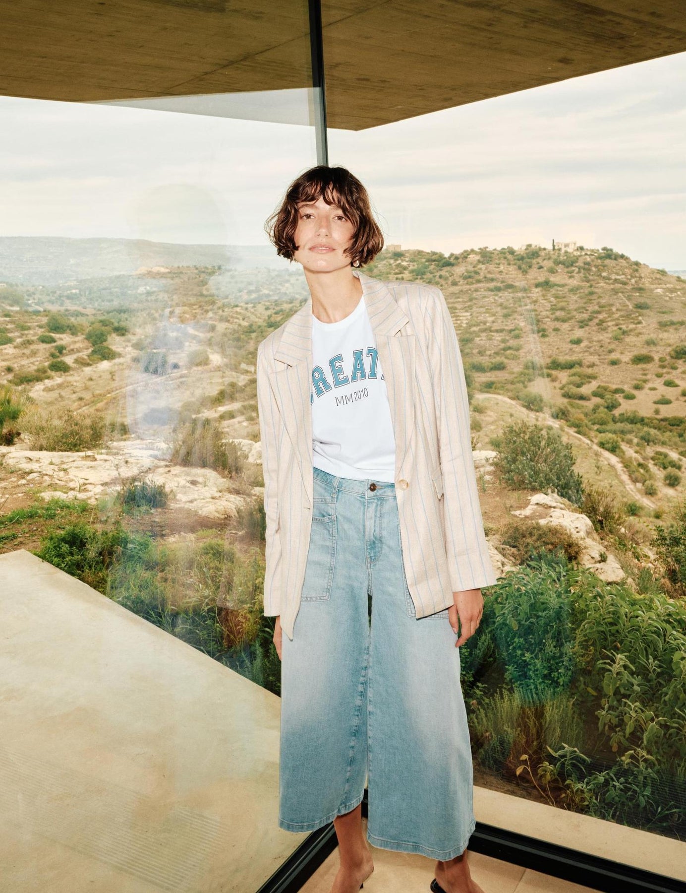 A fresh take on summer tailoring. The Mos Mosh Nancy Miriam Blazer blends breathable linen and viscose in a relaxed, oversized silhouette with soft stretch for comfort. Light blue pinstripes and wide ‘70s-inspired lapels give it a vintage edge, while the single-button closure, flap pockets, and satin lining add polish and flexibility. Style it with a tank and the matching trousers for a modern, laid-back suit look.