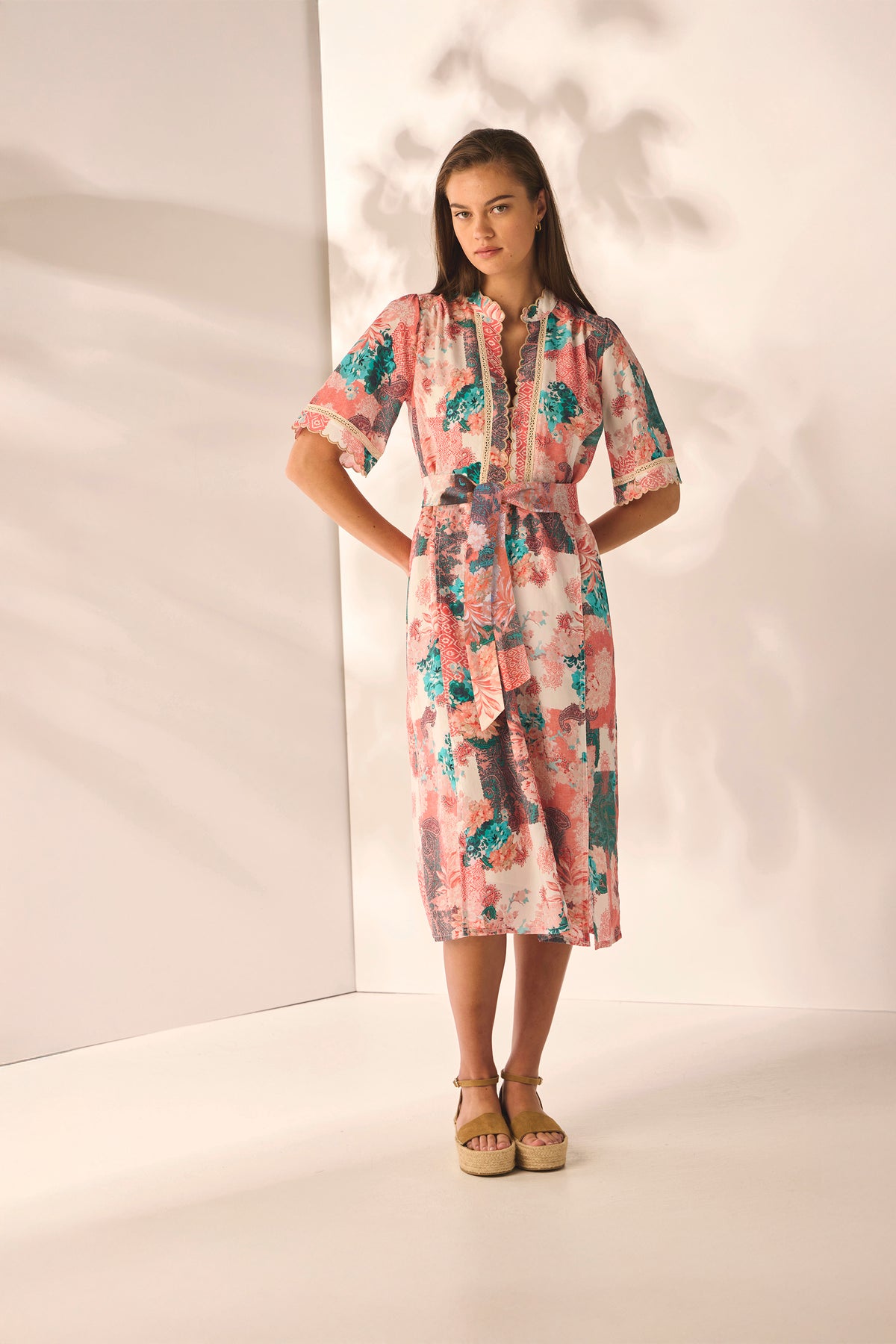 The Chantelle Dress is an elevated style featuring a delicate lace trim inserted into the centre front panel and cuff, with the scallop embroidery around the neckline, centre front opening and cuff. An flattering a-line silhouette with buckled tie at the waist and hidden pockets.