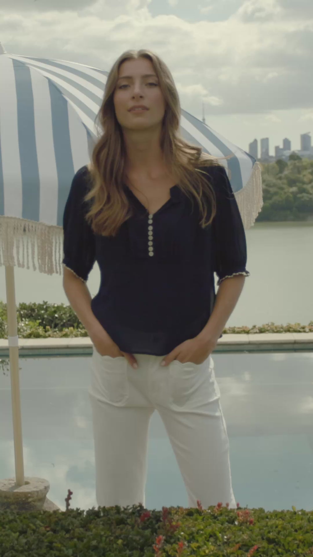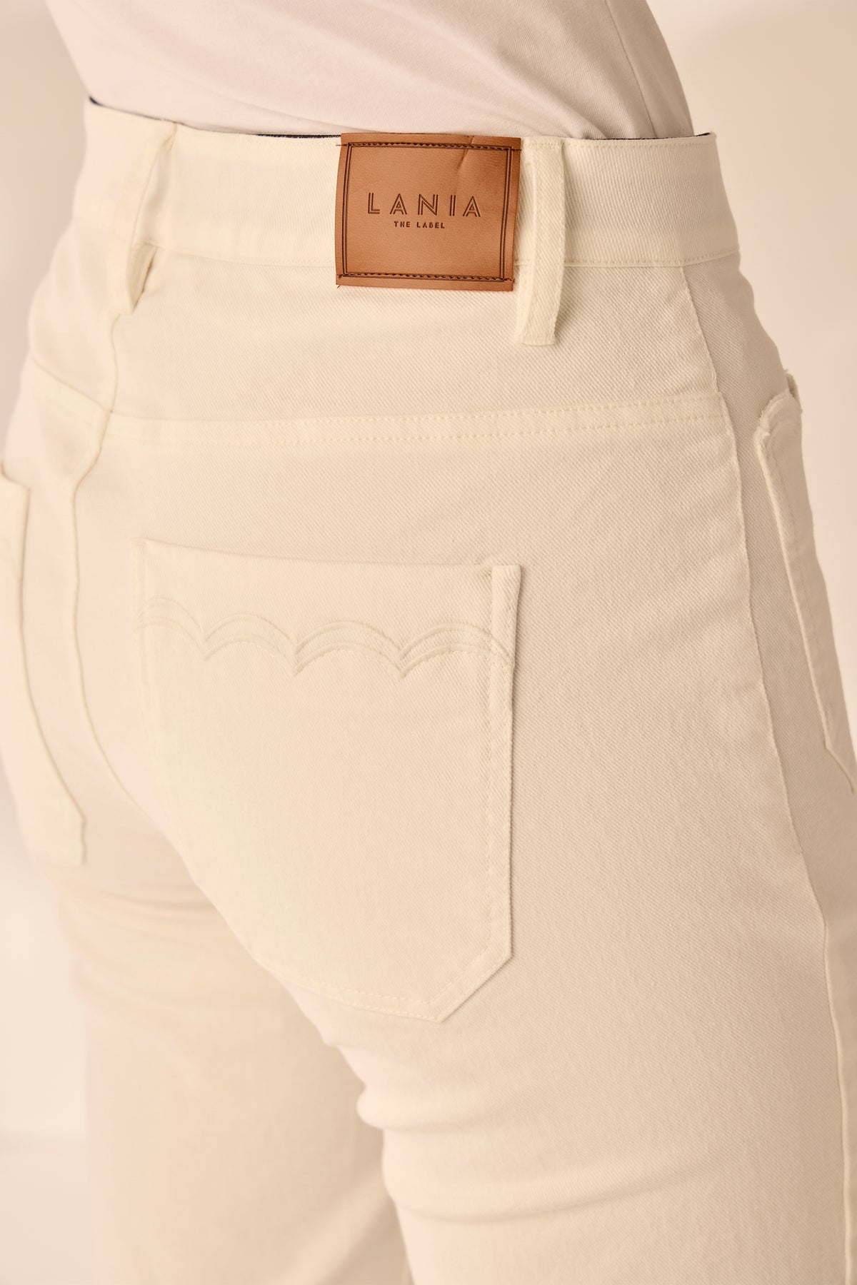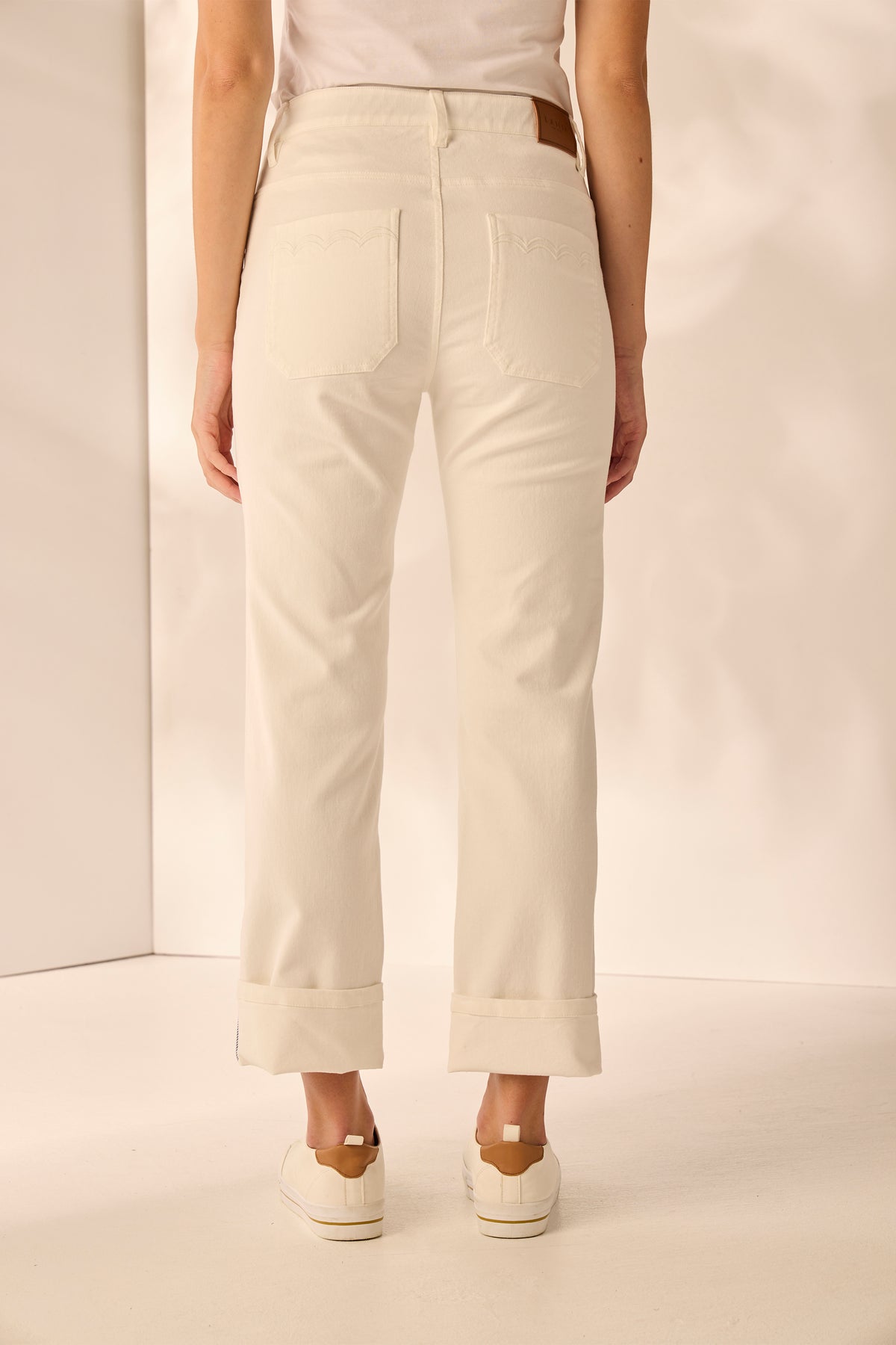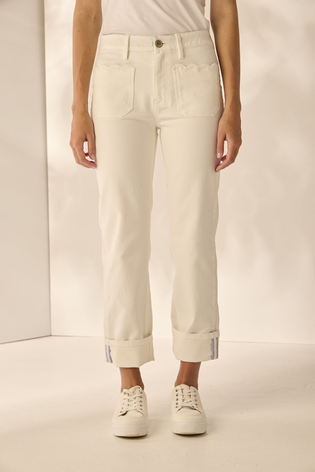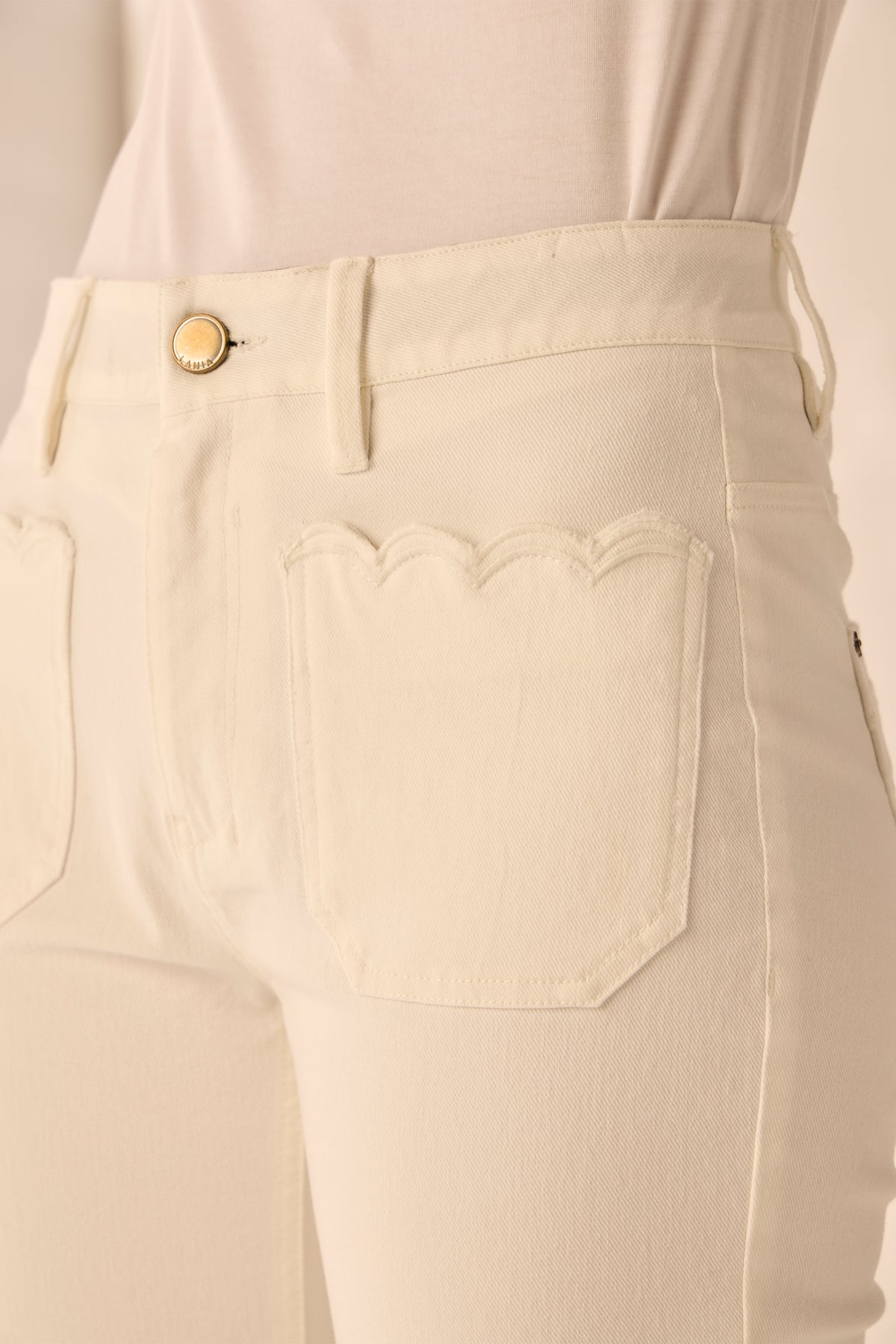 Step into style with the Chloe Jean, offering a mid-rise straight leg fit and modern deep front patch pockets. Embroidery scallop edging on the front patch pocket adds a touch of uniqueness to the style and making these jeans a must-have for the spring wardrobe.