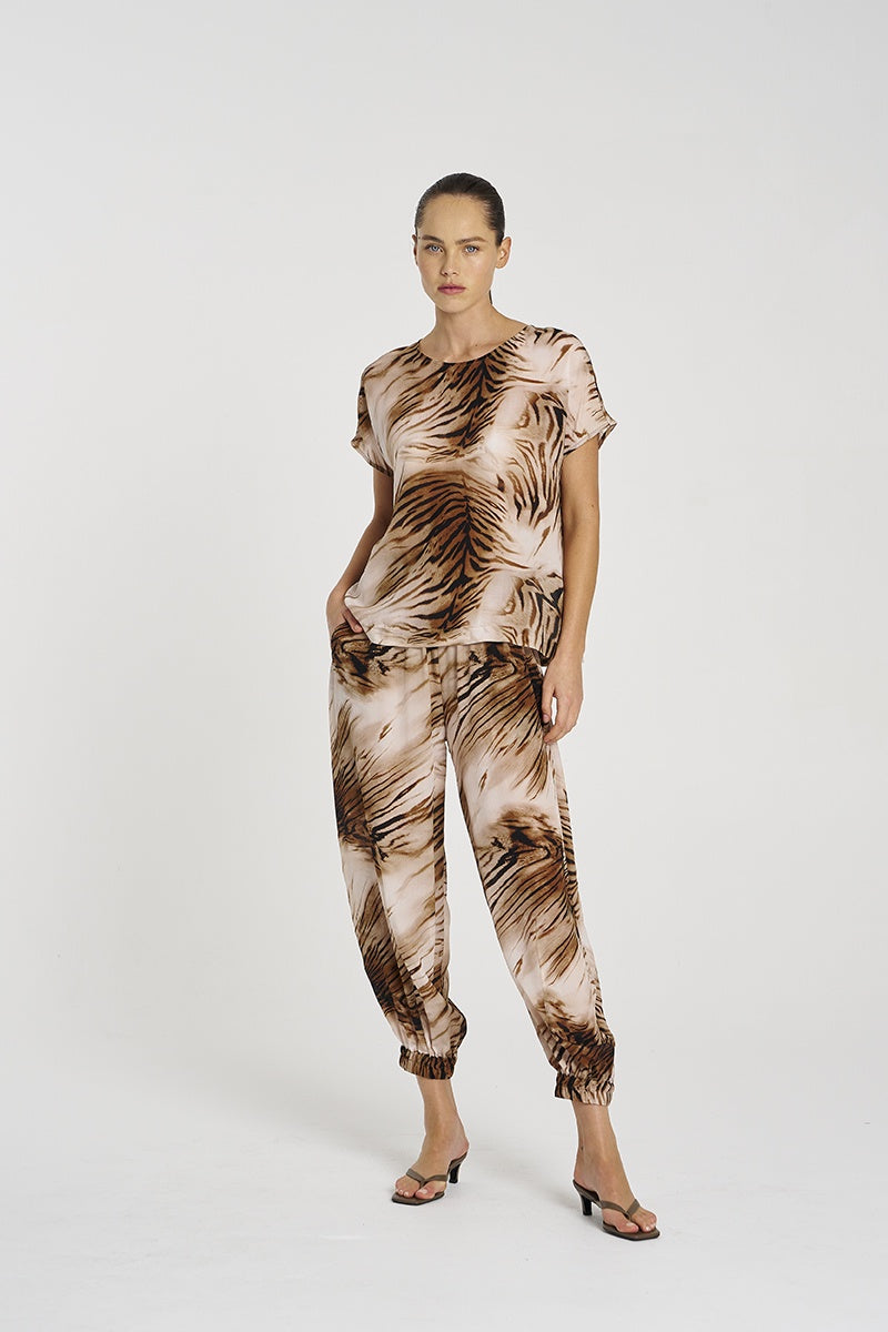 Crafted in Mela Purdie's mid-weight, soft washed Silk Crepe De Chine, featuring the bold  Silk Tiger Print. The Cap Shell is a versatile staple silhouette.