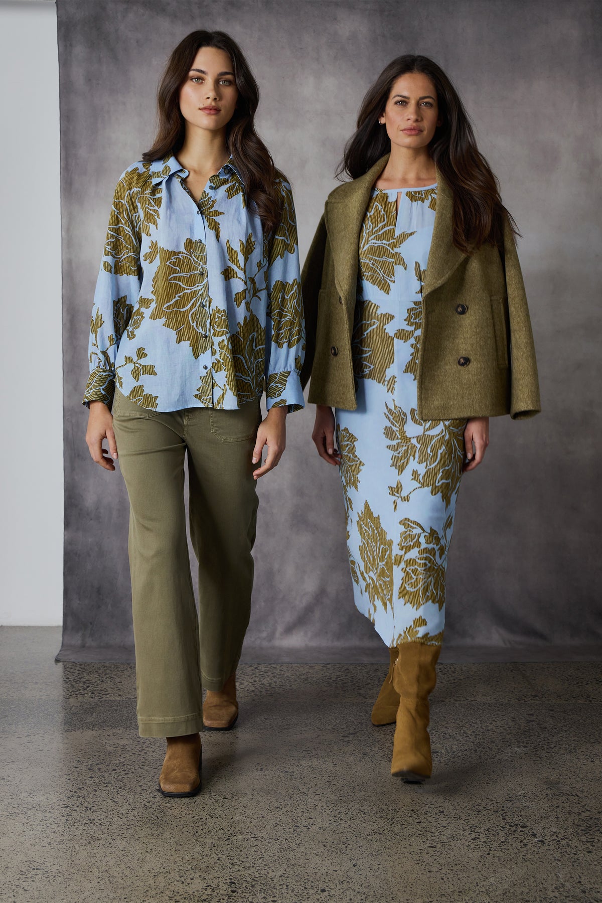 The Cello Dress is a slimline midi featuring a shaped underbust seam for a flattering fit. A keyhole opening with a front twist adds subtle allure, while softly gathered full-length sleeves with deep shirred cuffs complete the look. A timeless piece that exudes elegance and sophistication.