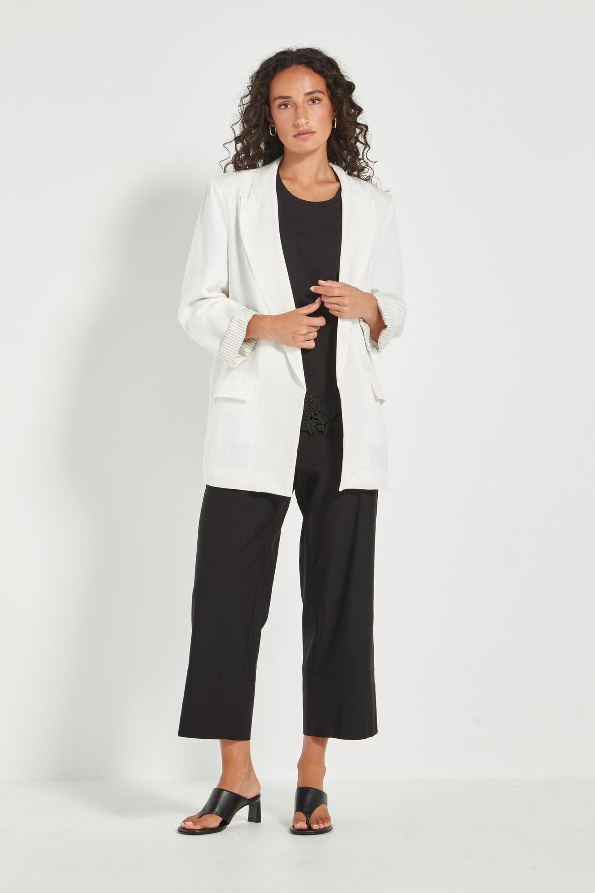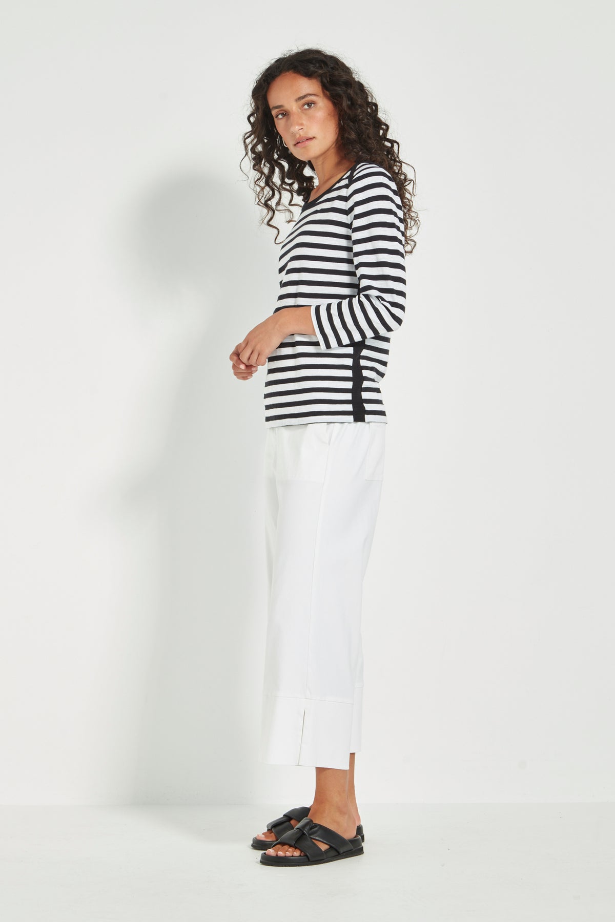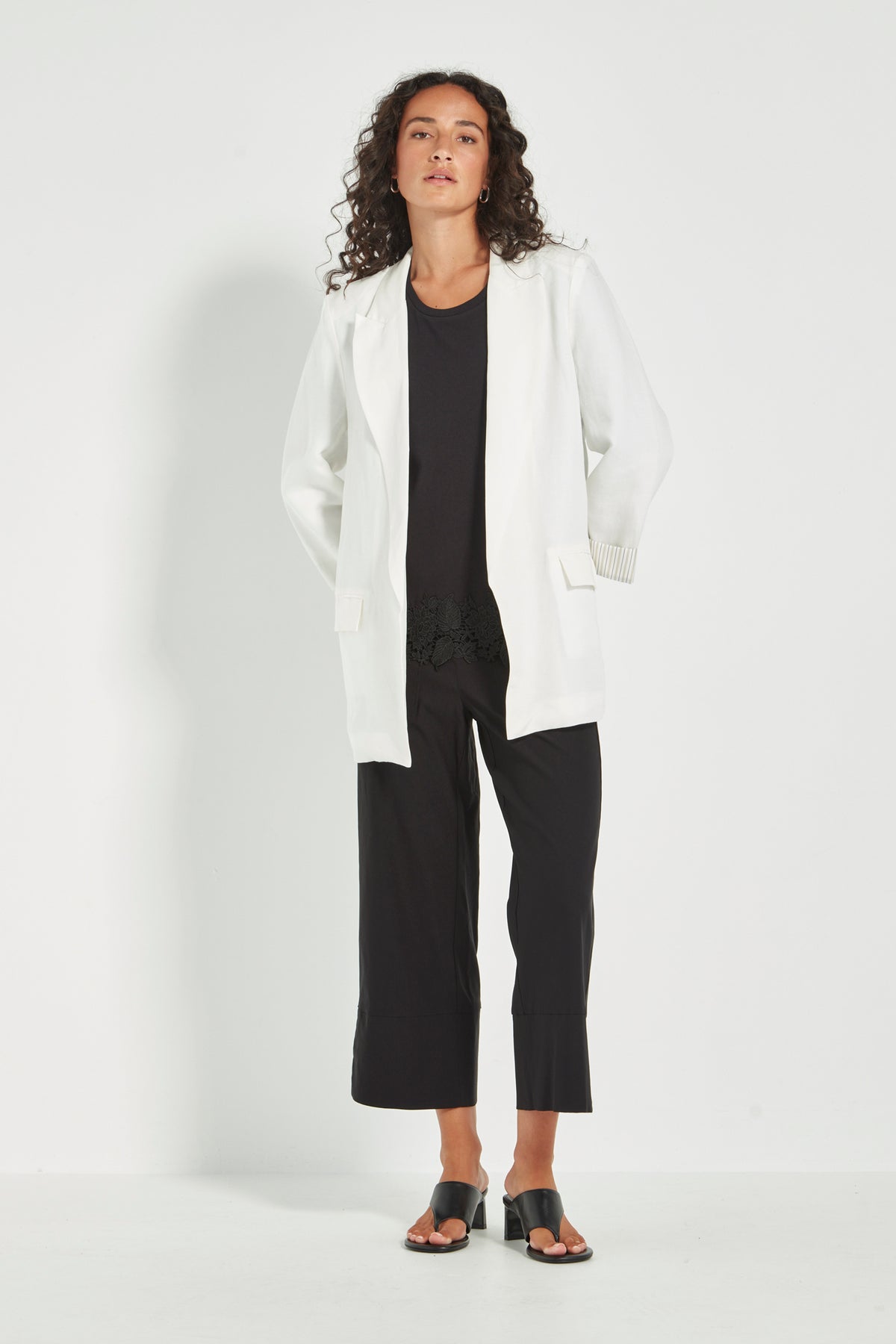 A modern essential with elevated ease, the Rico Pant is crafted from an ultra-soft rayon-nylon-elastane blend that delivers all-day comfort while retaining its shape. Featuring a flat front waistband with self-binding and an elasticated back for a flexible, flattering fit, this pant balances style and comfort seamlessly. Slant front patch pockets and back patch pockets lend a laid-back utility, while the wide 7/8 leg is finished with a deep cuffed hem and subtle side splits—adding a cool, contemporary edge. Easy to dress up or down, the Rico Pant is a must-have travel essential.