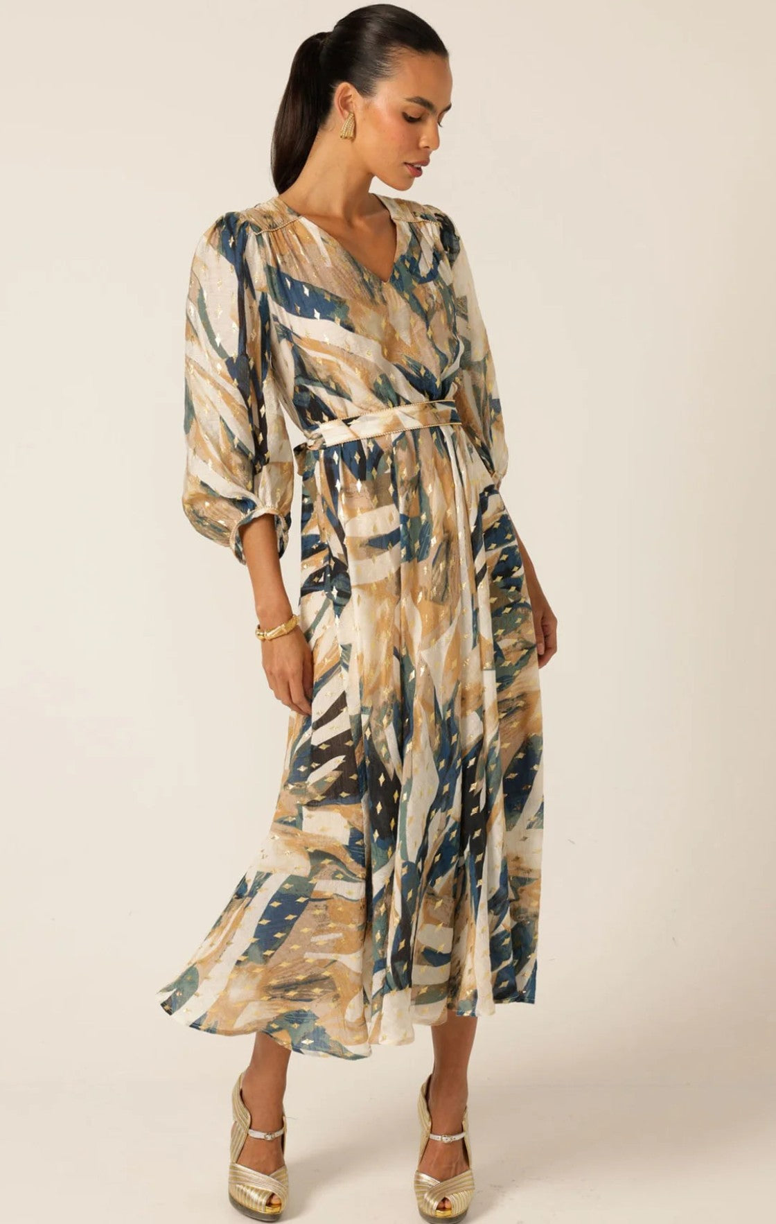 Made from luxurious cotton with gold metallic detailing, the La Mer Midi Dress features a soft bloused sleeve, midi length, and delicate gold-beaded trim on the belt and shoulder panels. The relaxed silhouette can be cinched with the detachable self-tie belt, making it a versatile choice for both elevated events and effortless everyday wear.