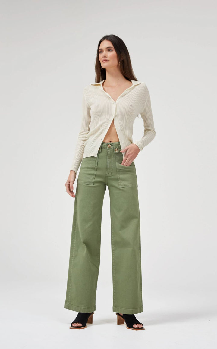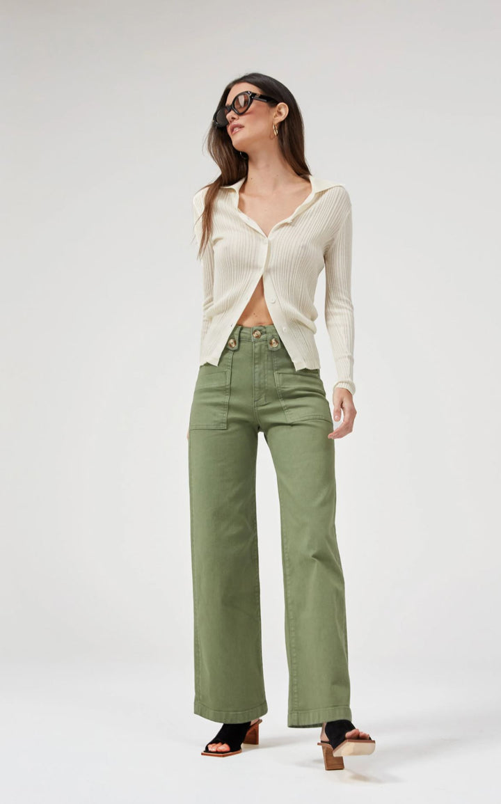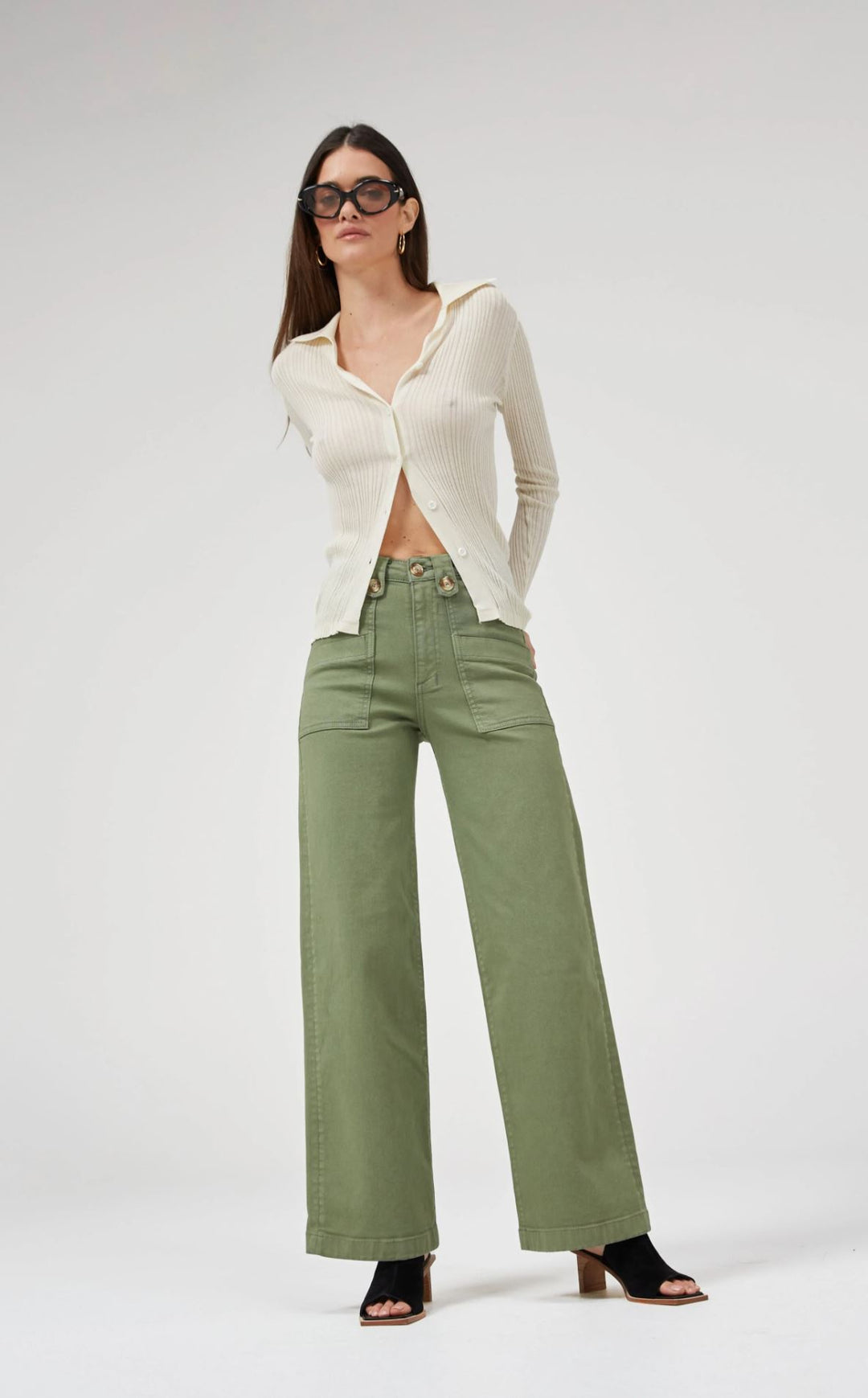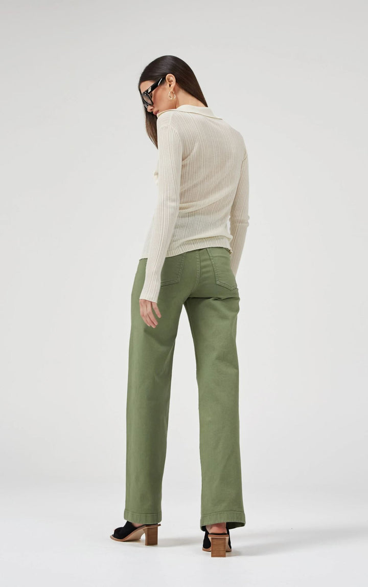 Our signature Tailored Trousers, Carrie, are designed like jeans. They have a high-waisted, fitted silhouette and wide, straight legs that sit just below the ankle.