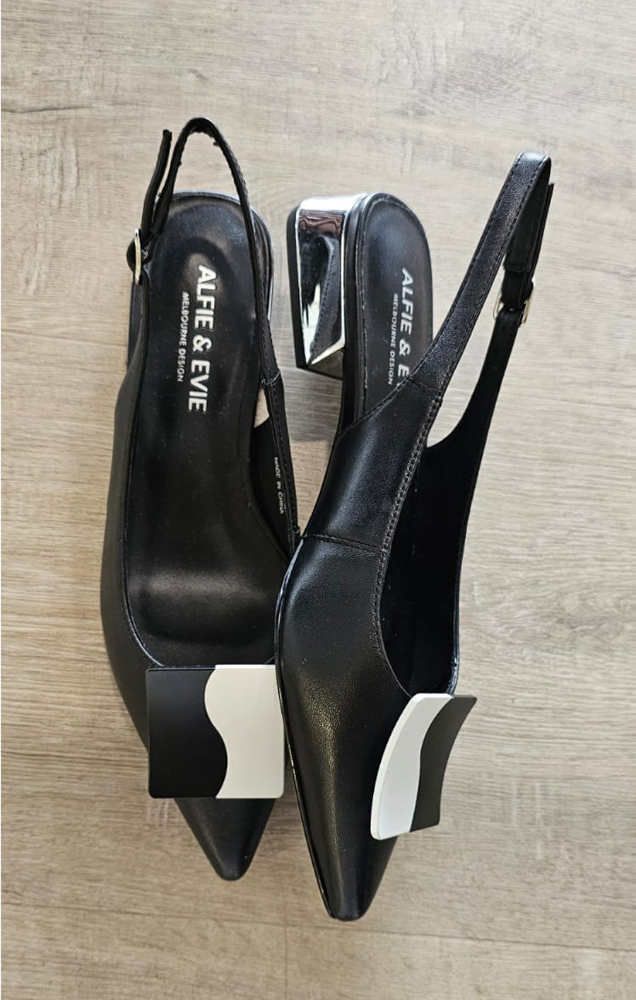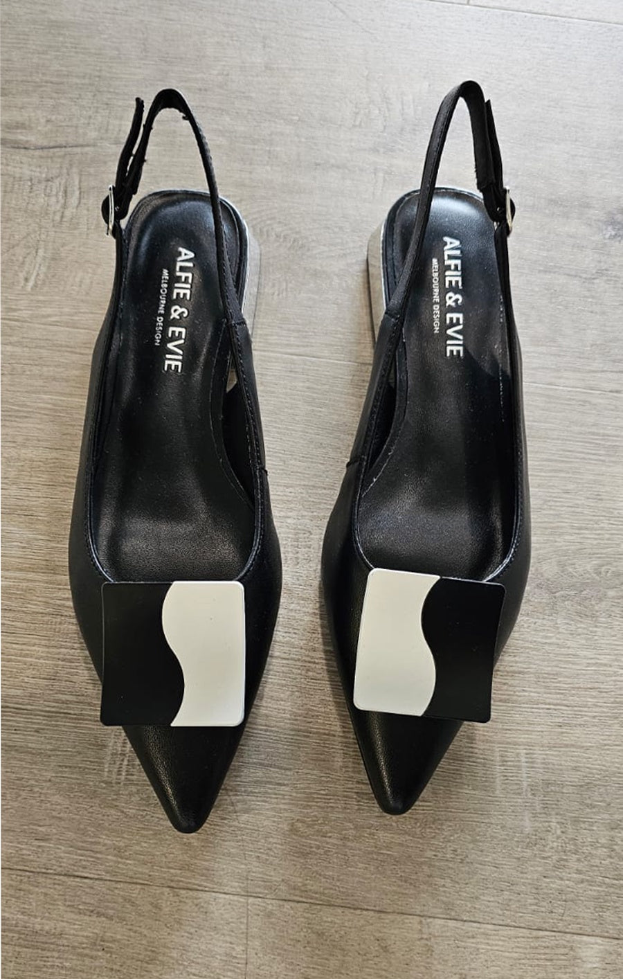 This sleek slingback by Alfie & Evie combines modern elegance with wearable ease. Crafted in black with a pointed toe and low block heel, it features a bold black & White embellishment across the front and a subtle silver mirror accent at the heel for a refined finish. Designed for day-to-night versatility, it pairs effortlessly with tailored looks or elevated casual wear.
