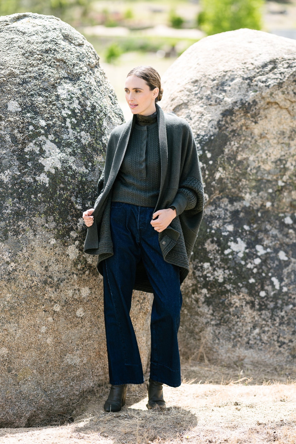Its clever two‑way styling makes it truly versatile: button it traditionally around the collar for a classic, relaxed look, or fasten it around the hem to create a completely new silhouette with modern shape and structure. The oversized fit enhances its easy, throw‑on appeal, while the cable‑knit pattern, ribbed cuffs and ribbed hem add texture and refinement.