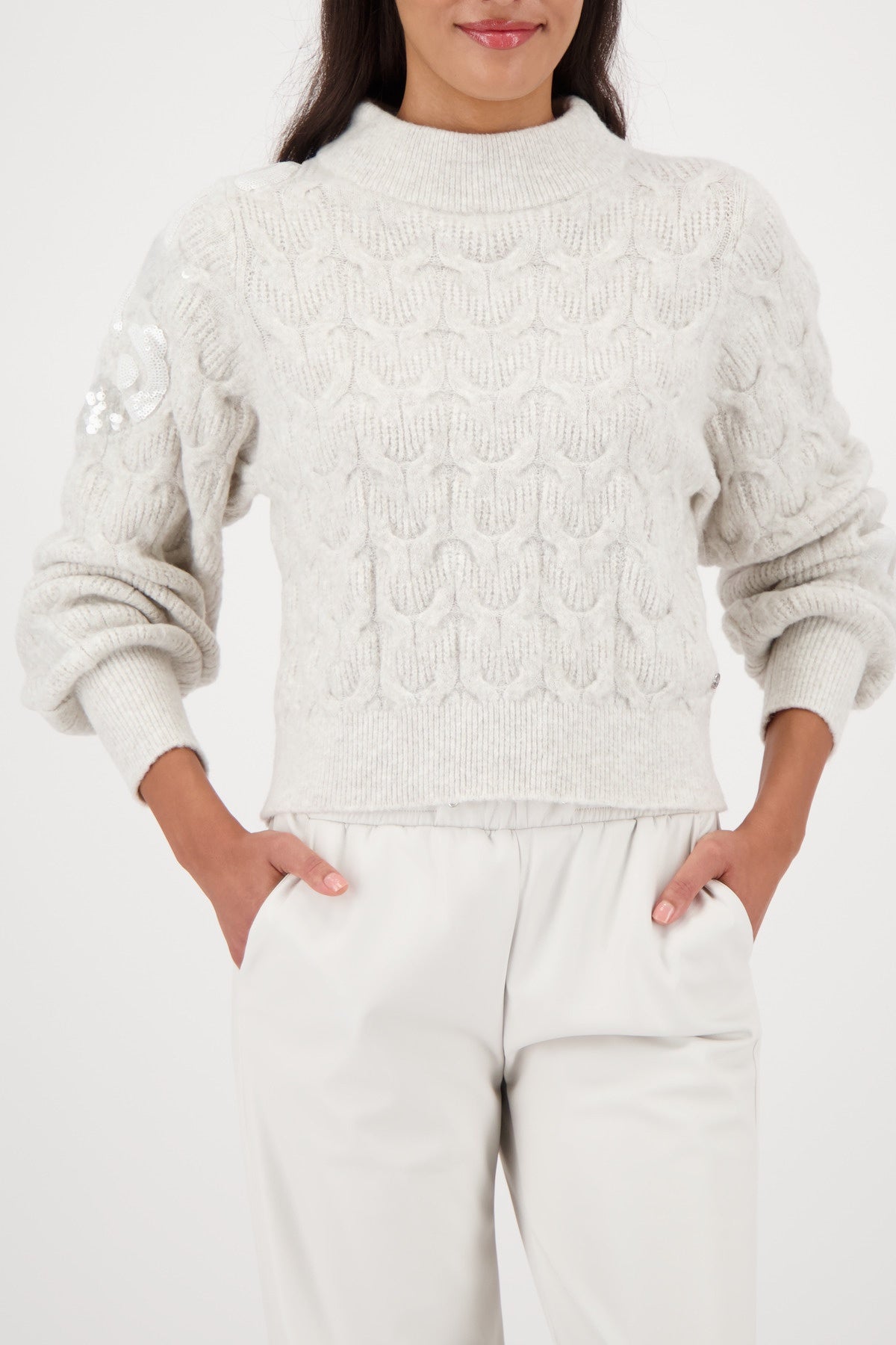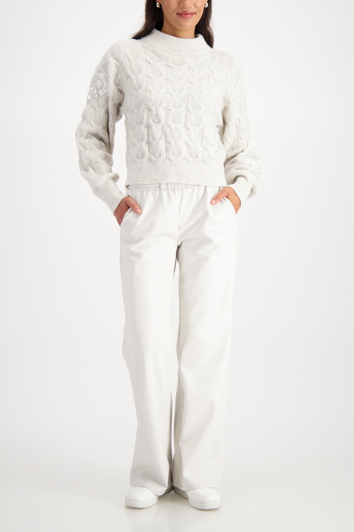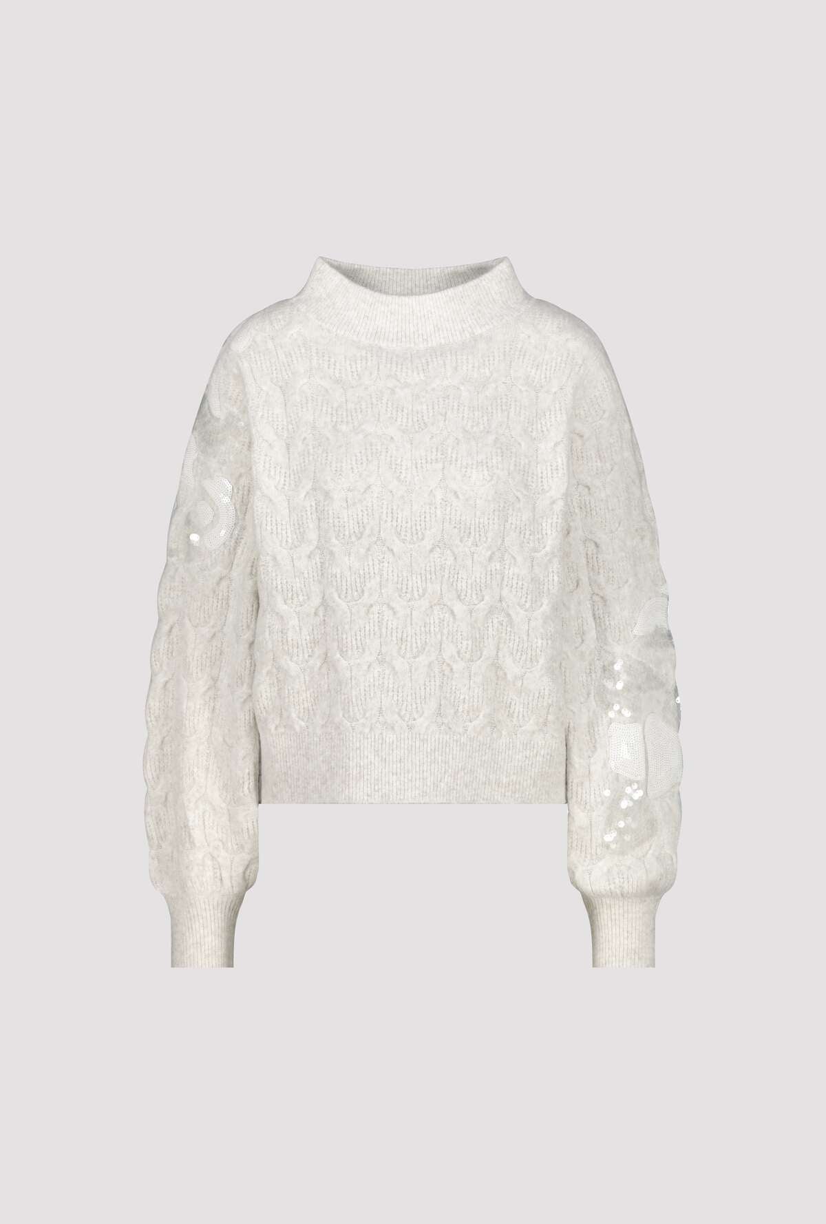 Indulge in luxurious comfort with the Monari Fleece Sweater, a beautifully knitted piece crafted from a high‑quality wool blend. Designed with an intricate cable‑knit pattern and delicate sequins, it brings subtle shimmer and sophistication to your everyday wardrobe.