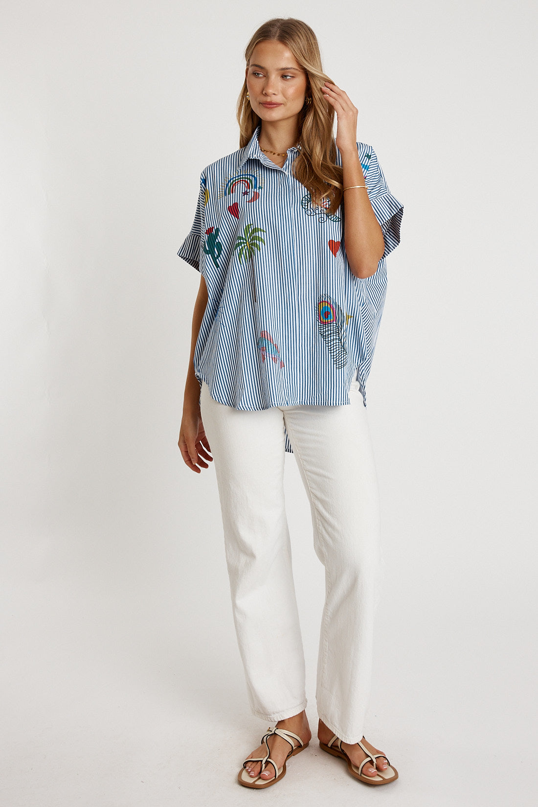 Playful, breezy, and easy to style, the LulaLife Tillie Shirt adds fun personality to your everyday wardrobe. Crafted from 100% cotton, it’s lightweight, breathable, and perfect for warm weather. The relaxed, wide cut and collared neckline keep the fit laid-back, while the buttoned-through front and cuffed sleeves add simple, polished detail. Designed with a curved hem and longer back for extra coverage, it’s finished with quirky printed motifs that make the whole look pop. Proudly designed in Australia, this shirt pairs effortlessly with denim, shorts, or linen pants for cheerful daily style.