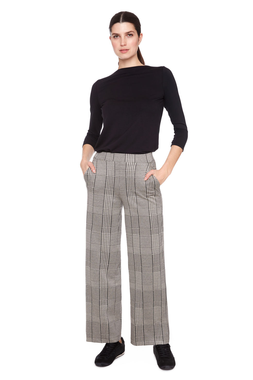 Sophisticated with an old-school spin, classic plaid gets a chic upgrade in a duotone color palette for a decidedly distinguished take. The trendy wide-leg and classic full-length play up the bookish print, exuding a refined sophistication that feels elevated yet effortless, with an enduring office-appropriate appeal.
