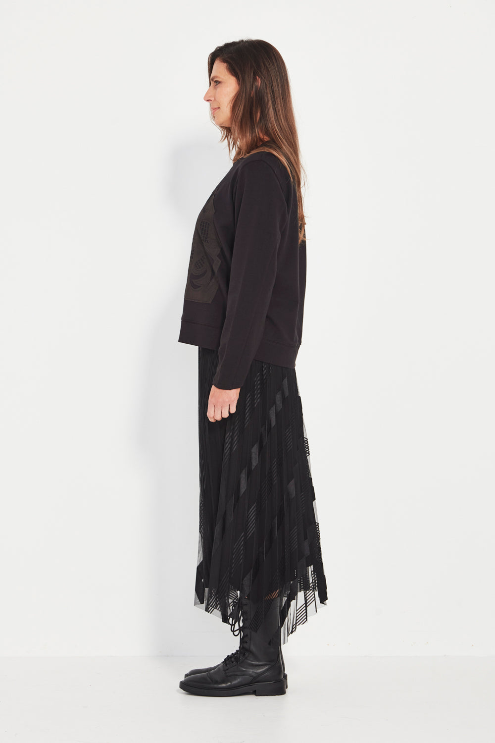 An elasticated waistband ensures an easy, comfortable fit that sits smoothly on the waist. The asymmetrical hem adds a modern, dynamic finish, giving the skirt a sense of flow and sculptural shape.