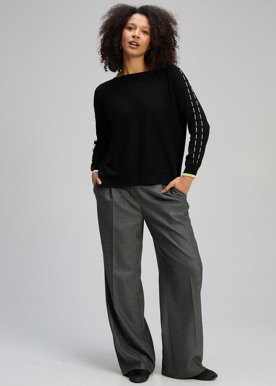 Elevate your everyday wardrobe with the Zaket & Plover Threaded Sleeve Jumper, a modern update on a timeless black knit. The standout detail—white contrast stitching running down the sleeves—adds a fun, feminine touch that brings personality to your winter rotation.