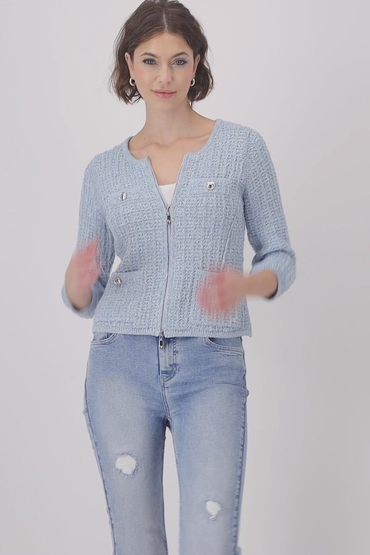 Elevate your wardrobe with this sophisticated tweed cardigan, crafted from a high-quality cotton blend interwoven with glittering Lurex for a subtle shimmer. The woven texture and slightly fitted cut create a flattering silhouette, while thoughtful design elements add both style and practicality.